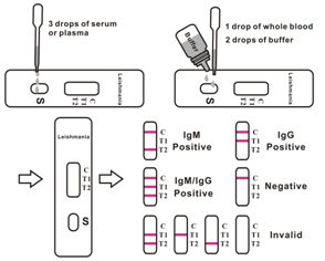 Positive: Control line and at least one test line appear on the membrane. The appearance of T2 test line indicates the presence of Leishmania specific IgM antibodies. The appearance of T1 test line indicates the presence of Leishmania specific IgG antibodies. And if both T1 and T2 line appear, it indicates that the presence of both Leishmania specific IgG and IgM antibodies. The lower the antibody concentration is, the weaker the result line is.